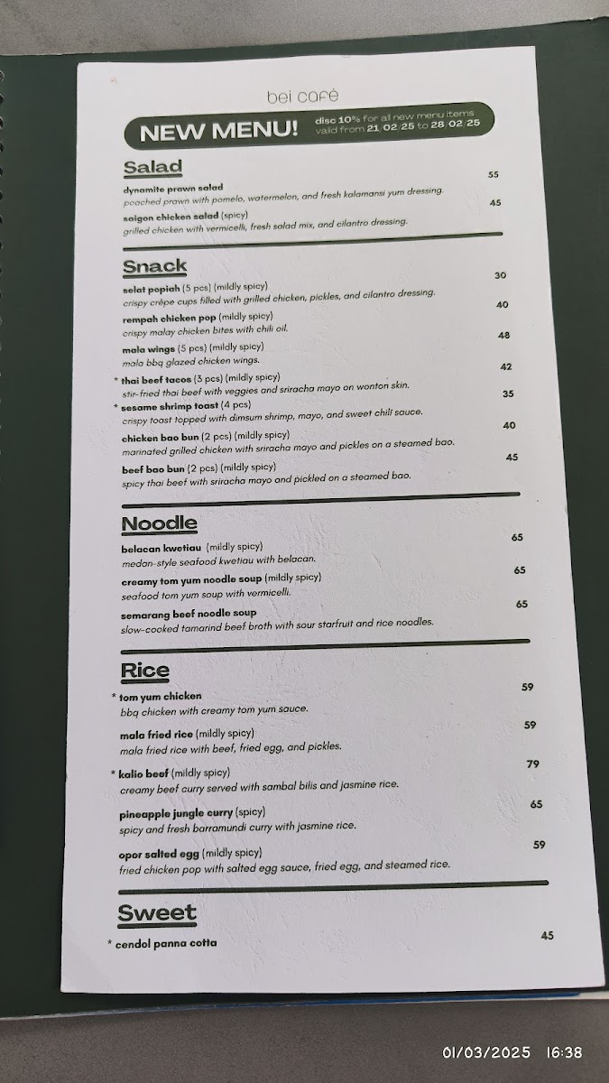 The menu features a variety of indulgent pastries and distinctive desserts like the Klepon Cake and Cinnamon Roll, ideal companions for a leisurely coffee break. Coffee lovers will find thoughtfully prepared drinks such as Bei's Iced Coffee, Matcha Latte, and Creeme Brulee Coffee that complement the café’s warm and inviting ambiance.